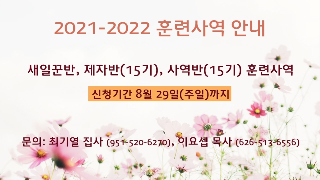 2021, 22년 훈련사역이 시작됩니다. 하나님께서는 우리 모두가 주님의 참된 제자로 훈련 받고 성장하길 원하십니다. 새일꾼반, 제자반, 사역반 훈련사역에 참여하길 원하시는 분들은, 8월 29일 주일까지, 담당자에게 신청해 주시기 바랍니다.