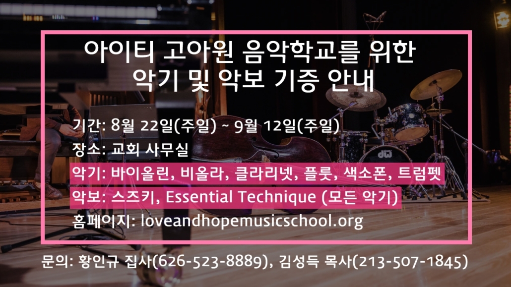 아이티의 수도 포르토프랭스의 시티솔레 마을 주위 고아원 음악학교를 도우려고 합니다. 음악학교를 위한 악기와 악보를 기증받고 있습니다. 각 가정마다 사용하지 않으나 연주가 가능한 악기를 기증해 주시기 바랍니다.