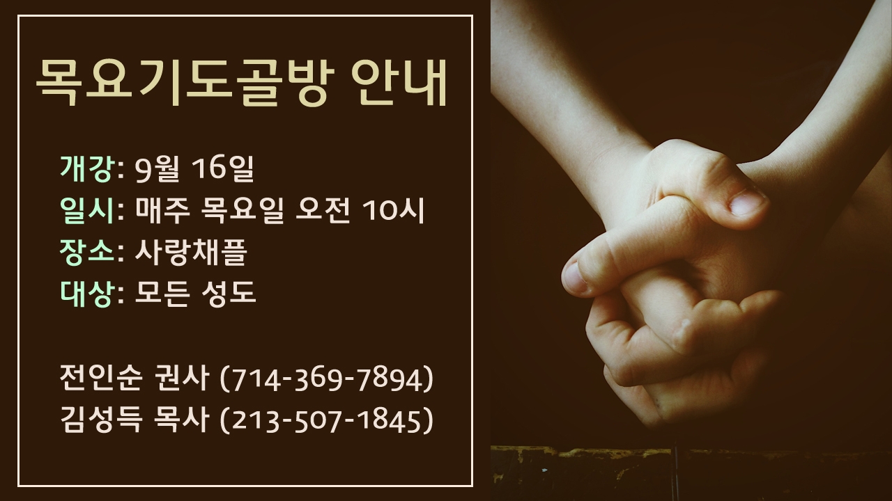 9월 16일부터 목요기도골방이 매주 목요일 오전 10시에 사랑채플에서 모입니다. 함께 기도하기 원하시는 모든 성도님들을 초대합니다.