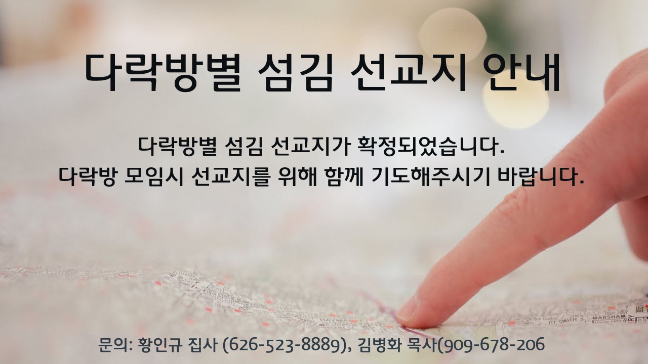 다락방별 섬김 선교지가 확정되었습니다. 주보 3면을 참고하셔서, 다락방 모임시 선교지를 위해서 함께 기도해주시기 바랍니다. 특별히 선교지 교회 개척을 위해서는 모든 다락방이 함께 협력하고 후원하며 기도해주시길 부탁드립니다.