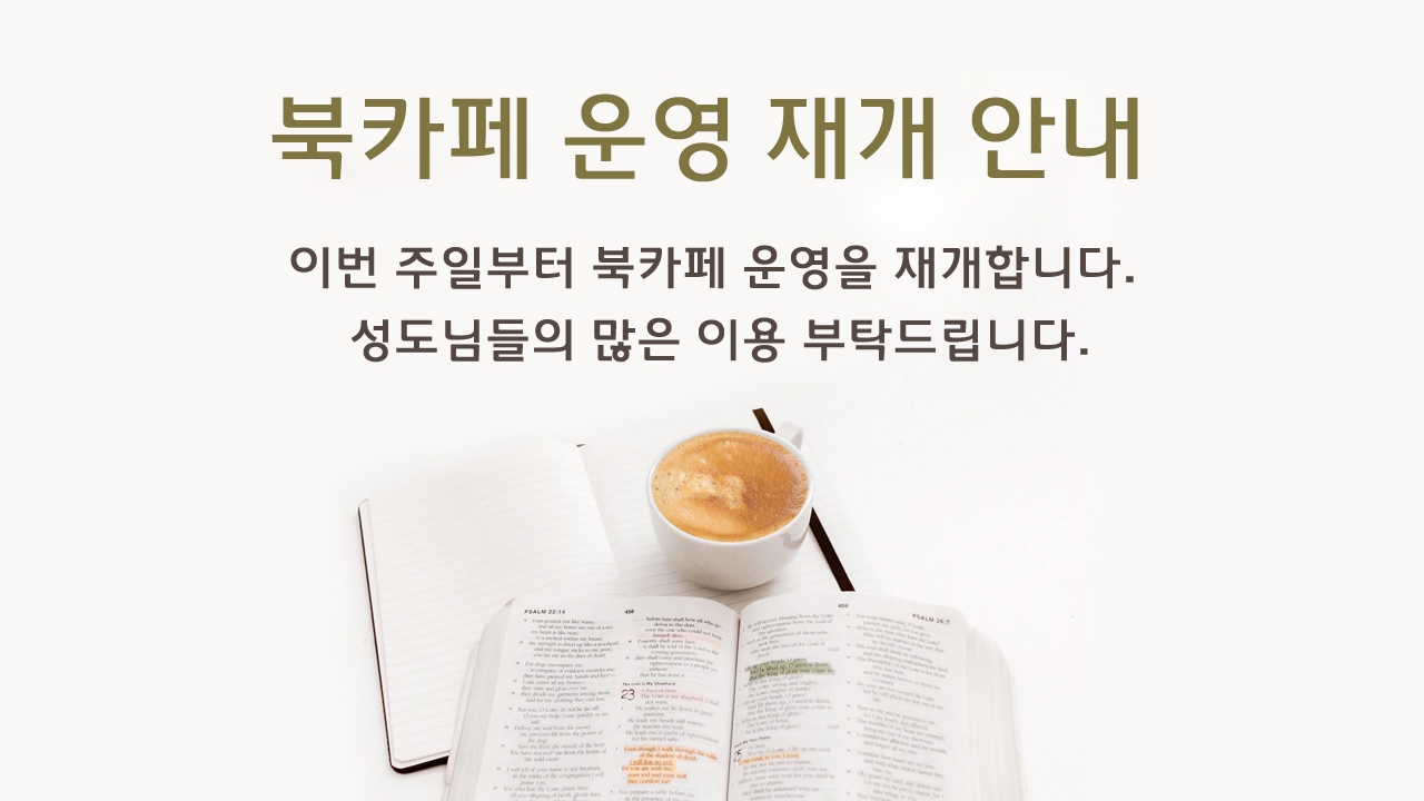 이번 주일부터 북카페 운영을 재개합니다. 성도님들의 많은 이용 부탁드립니다.