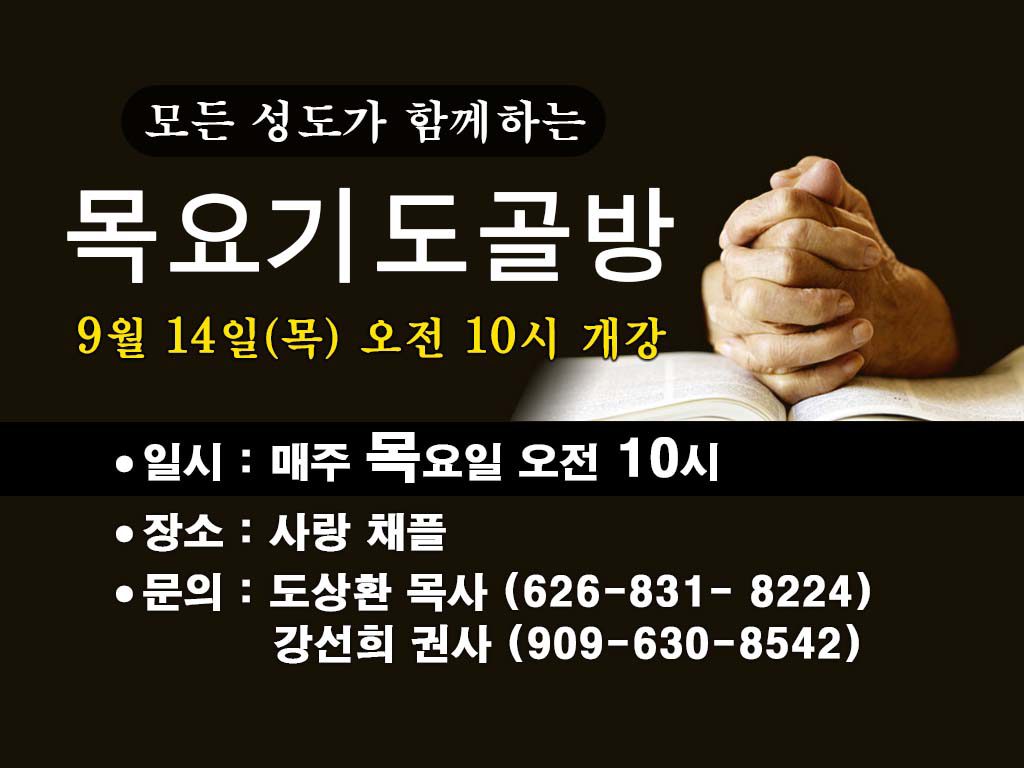 교회소식 목요기도골방 안내 9월14일 목요일 오전 10시 개강 기도하는 한 사람이 기도하지 않는 한 민족보다 강합니다. 열매 맺는 가을학기를 시작하며 기도의 자리에서 하나님을 만나는 은혜의 통로가 되시기 바랍니다. 일시: 매주 목요일 오전 10시(9월14일 개강) 장소: 사랑채플, 대상: 모든 성도 문의: 도상환 목사 (626-831-8224), 강선희 권사 (909-630-8542) September 7, 2017/by admin https://www.eastsarang.org/wp-content/uploads/2017/09/04-목요기도골방.jpg 768 1024 admin https://www.eastsarang.org/wp-content/uploads/2021/08/ESCC-Logo-SSSS.png admin2017-09-07 20:41:292017-09-08 20:42:55목요기도골방 안내