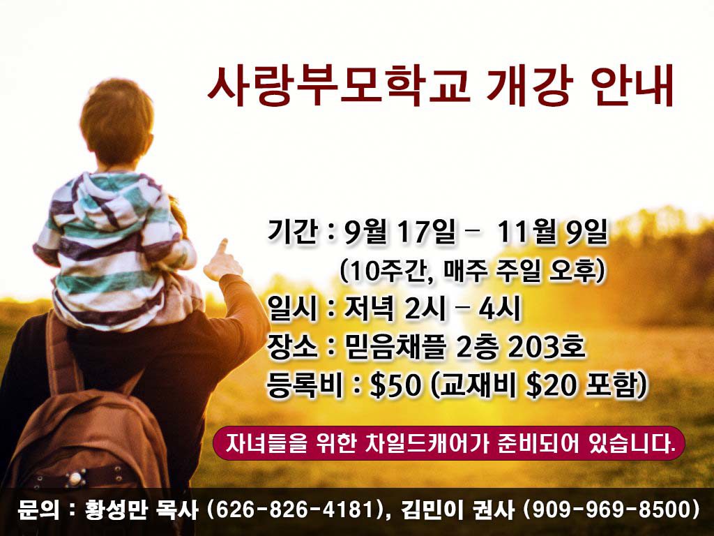 “은혜로 힘을 주는 부모학교” 를 통하여 하나님의 청지기로 자녀를 사랑하고 훈육하여 건강한 자아상을 그려주는 자녀교육의 원리를 배우기를 원하는 부모를 초대합니다