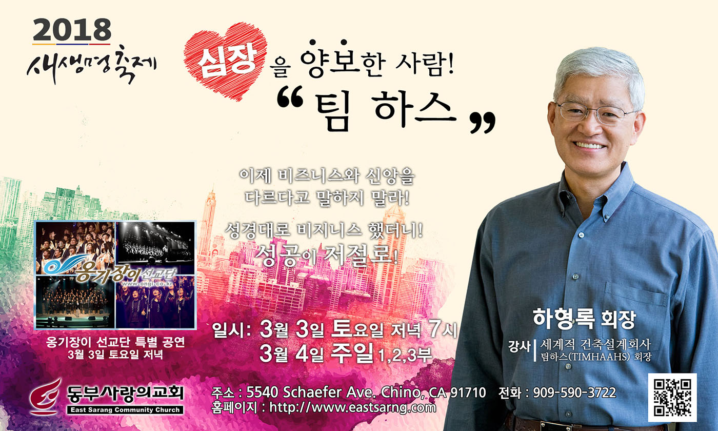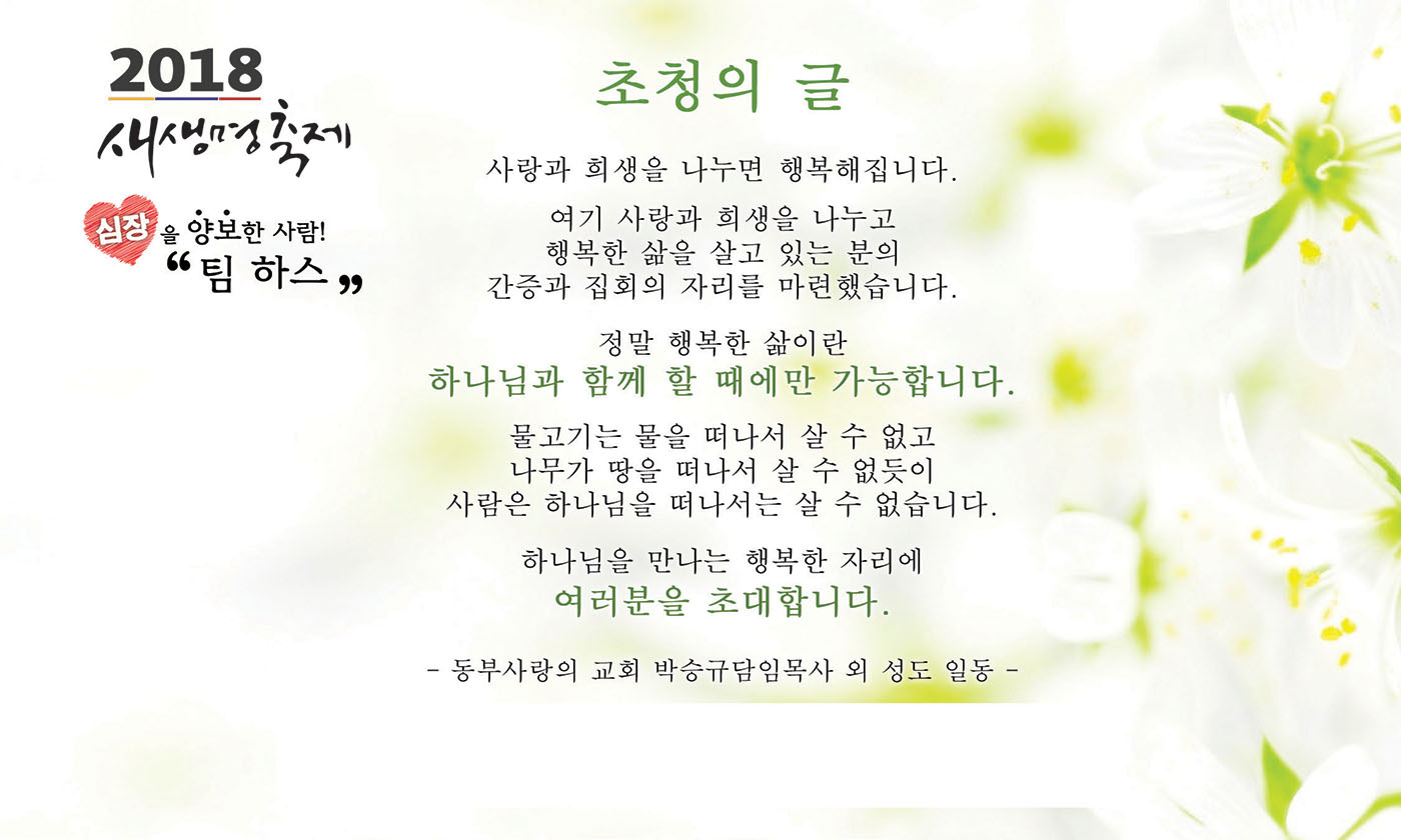 심장을 양보한 사람! 팀 하스 건축회사 회장님을 모시고 새생명축제를 준비합니다. 2018년 새생명축제에 기쁨으로 태신자를 작정하시고, 한 영혼 이상을 주님께로 인도하시기 바랍니다. 금번 새생명축제는 할아버지 할머니, 아빠 엄마, 자녀들 삼세대가 함께 하는 전도축제입니다.