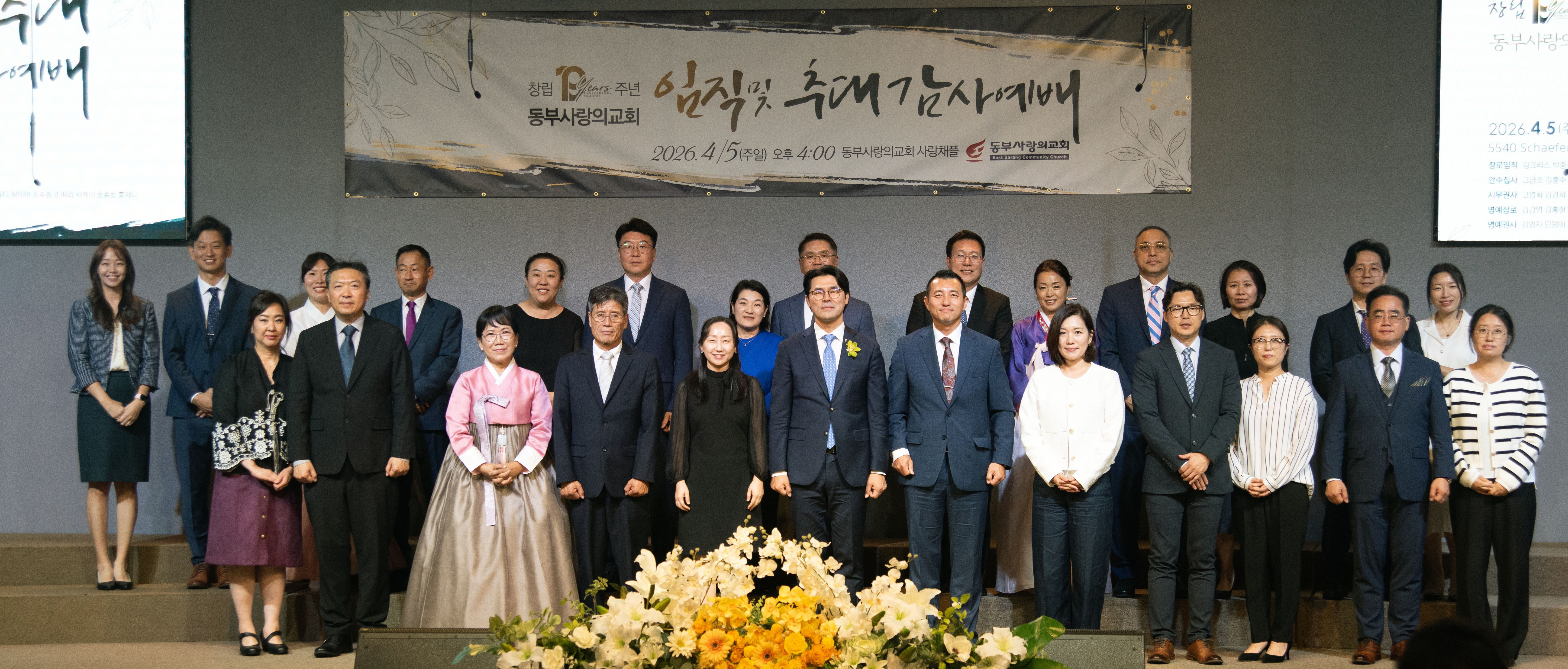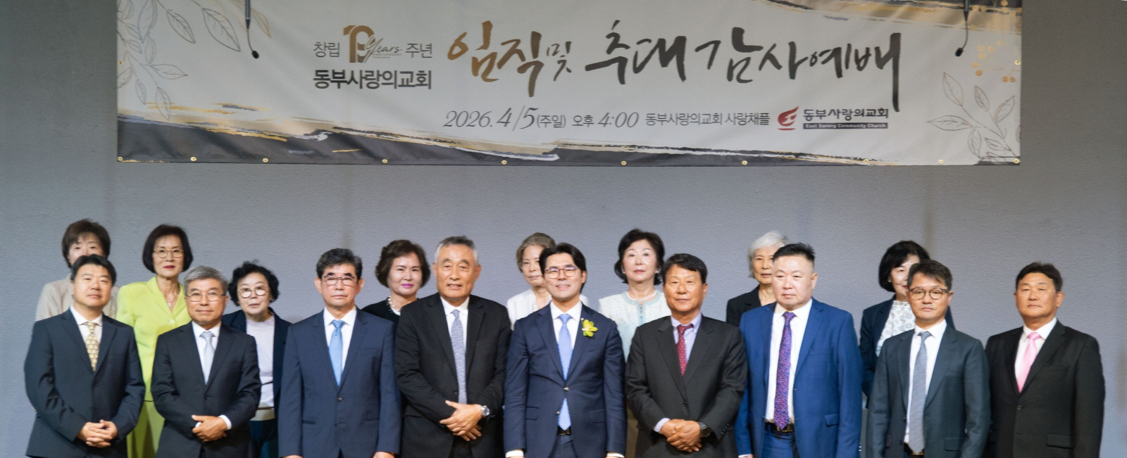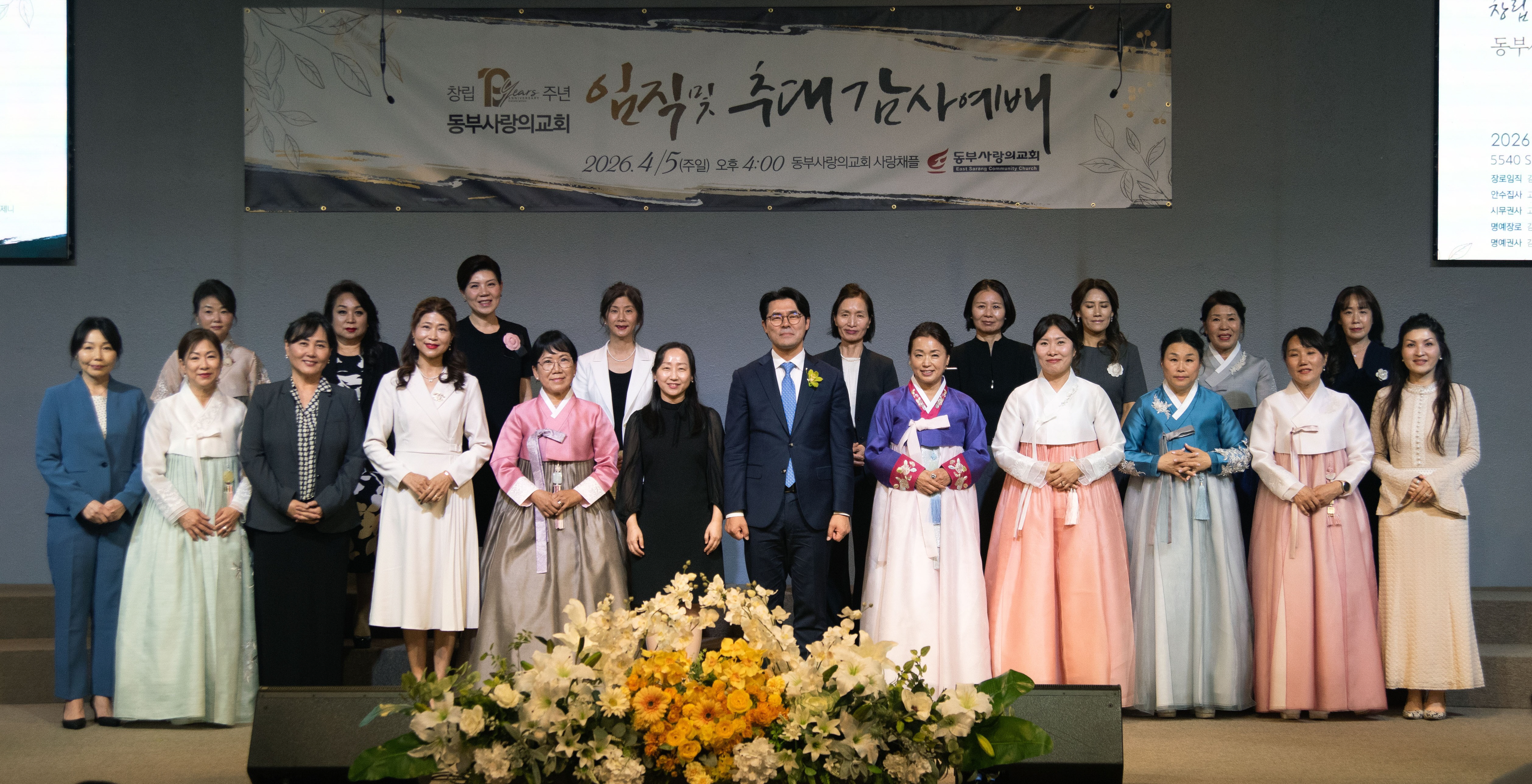 포토 갤러리 창립 19주년 임직 및 추대 감사예배2026/04/05 창립 19주년 임직 및 추대 감사예배가 은혜 가운데 진행되었습니다. 임직하신 장로, 안수집사, 권사님들과 추대되신 명예장로, 명예권사님들 모두를 축복하며 이후의 사역과 삶에 더 풍성한 은혜와 열매가 넘치기를 함께 기도합니다. April 7, 2026/by admin https://www.eastsarang.org/wp-content/uploads/2026/04/editdgt_350251-scaled.jpg 993 2560 admin https://www.eastsarang.org/wp-content/uploads/2021/08/ESCC-Logo-SSSS.png admin2026-04-07 11:17:022026-04-17 10:56:56창립 19주년 임직 및 추대 감사예배